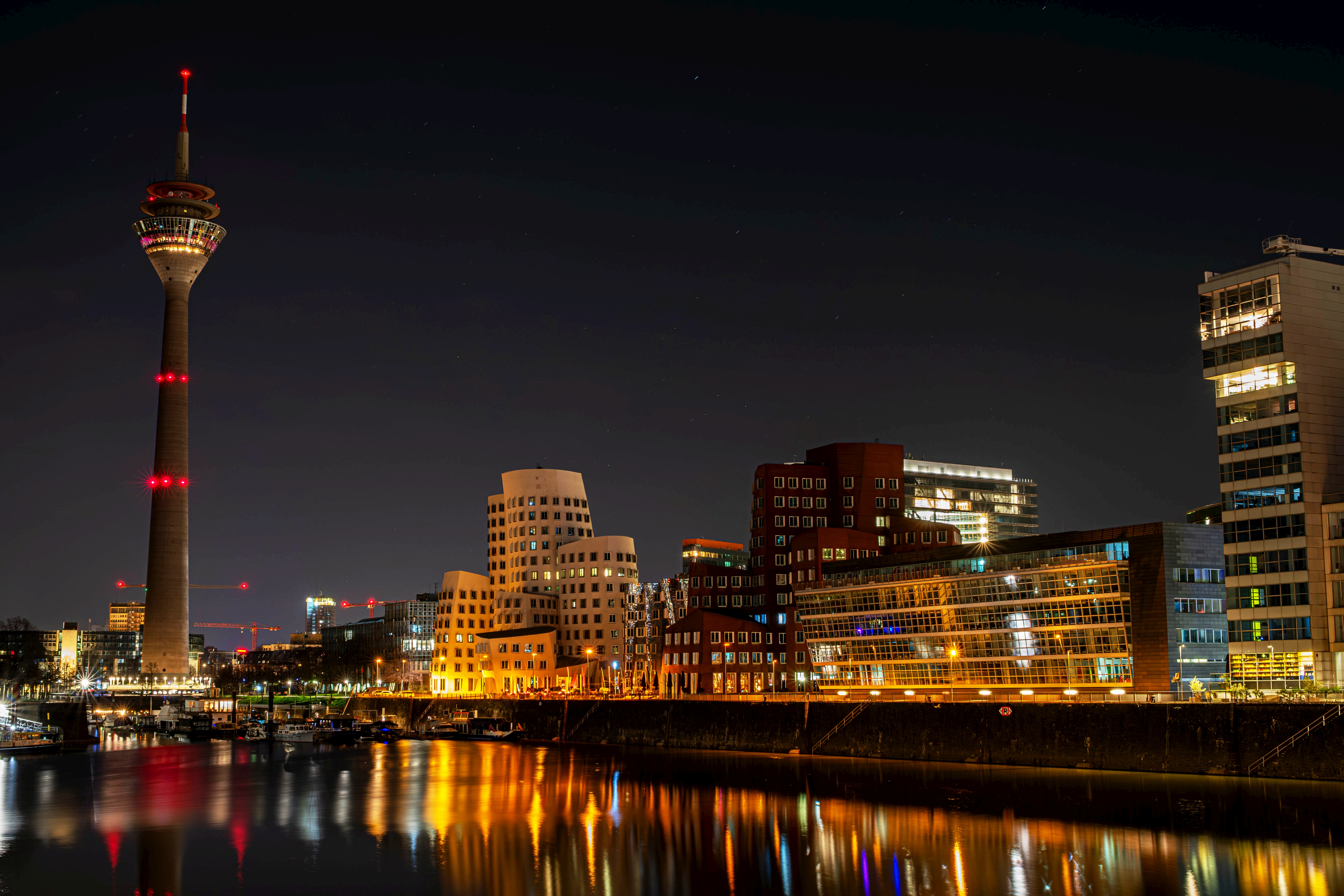 Der Düsseldorfer Hafen an einem besonderen Abend: Die leuchtende Zeitanzeige am Rheinturm ist ausgeschaltet. Dieses Foto ist sehr einfach zu erstellen; man braucht eigentlich nur ein Stativ und einen Fernauslöser.