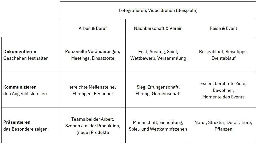 Die folgende Tabelle zeigt, welche Anwendungsgebiete dieses Tutorial im Auge hat. Mit diesem Kurs ist also nicht beabsichtigt, dass Du Profi-Fotograf wirst. Auch wollen wir Dich nicht animieren, Aufträge an bislang engagierte freie Fotografen zu reduzieren. Es geht ganz einfach darum, im normalen Alltag exzellente Fotos und Videos zu erstellen und dem Mittelmaß ade zu sagen.