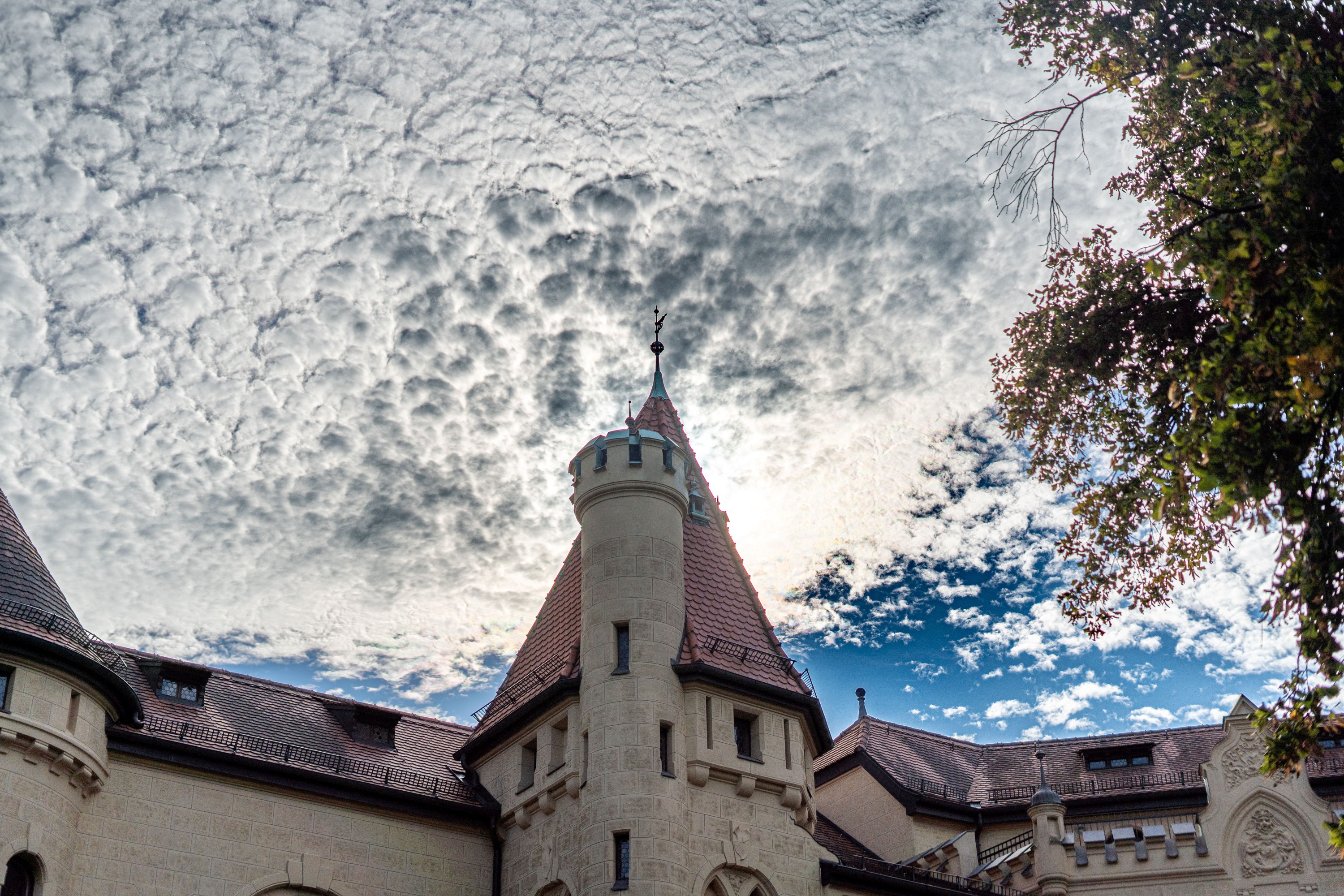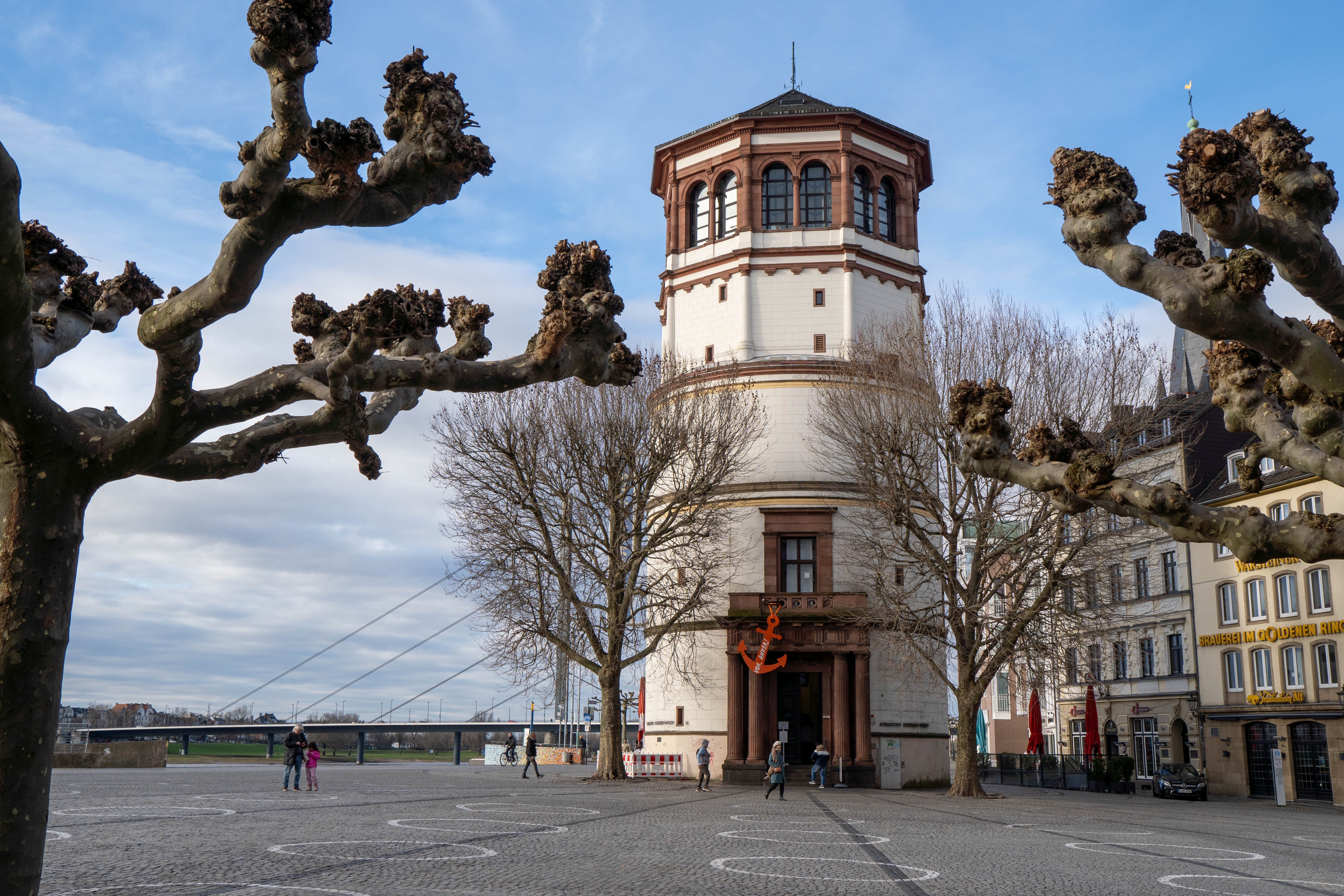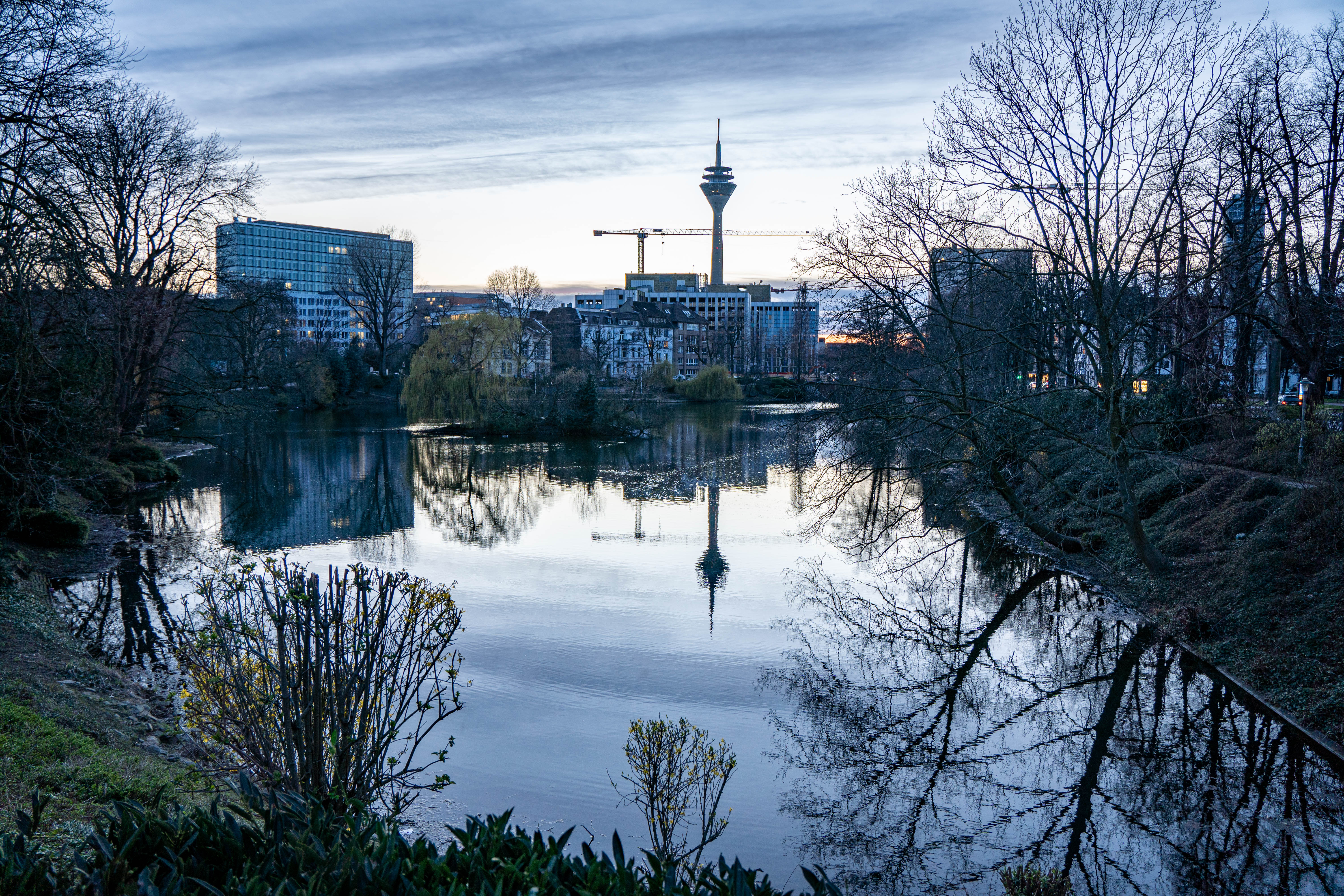 Dieses Bild konnte nur gelingen, weil es in Düsseldorf an diesem Tag windstill war; ansonsten wäre das Wasser in Bewegung geraten und hätte keinen Spiegeleffekt mehr generiert. Auch wäre Bewegungsunschärfe durch sich bewegende Zweige entstanden, denn die Belichtungszeit betrug 1/40 Sekunde.