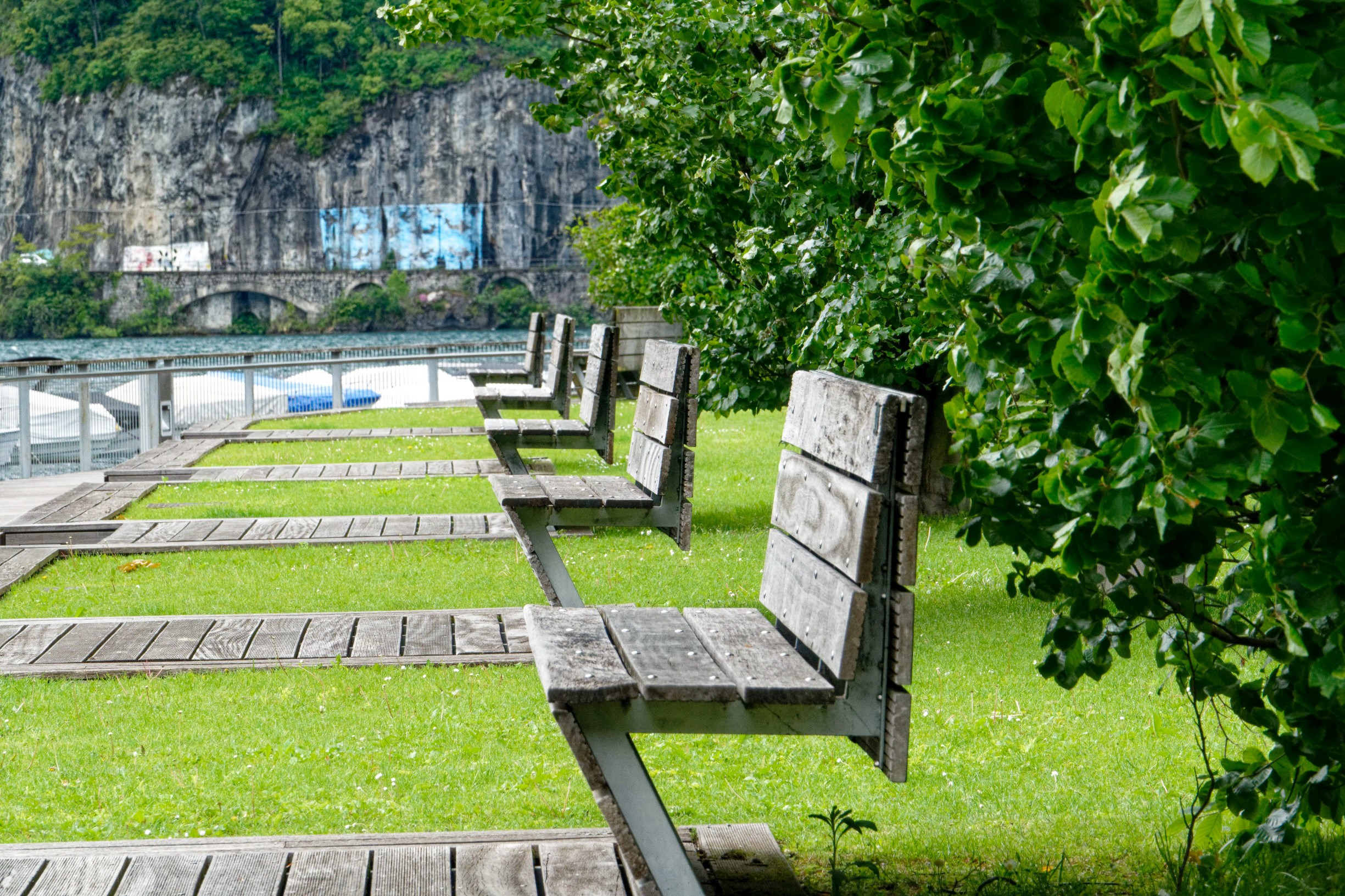 Zu den Strukturen zählen Linien, hier solche, die Gleichartigkeit verdeutlichen (alle Bänke sind gleich positioniert, mit gleicher Wegführung).