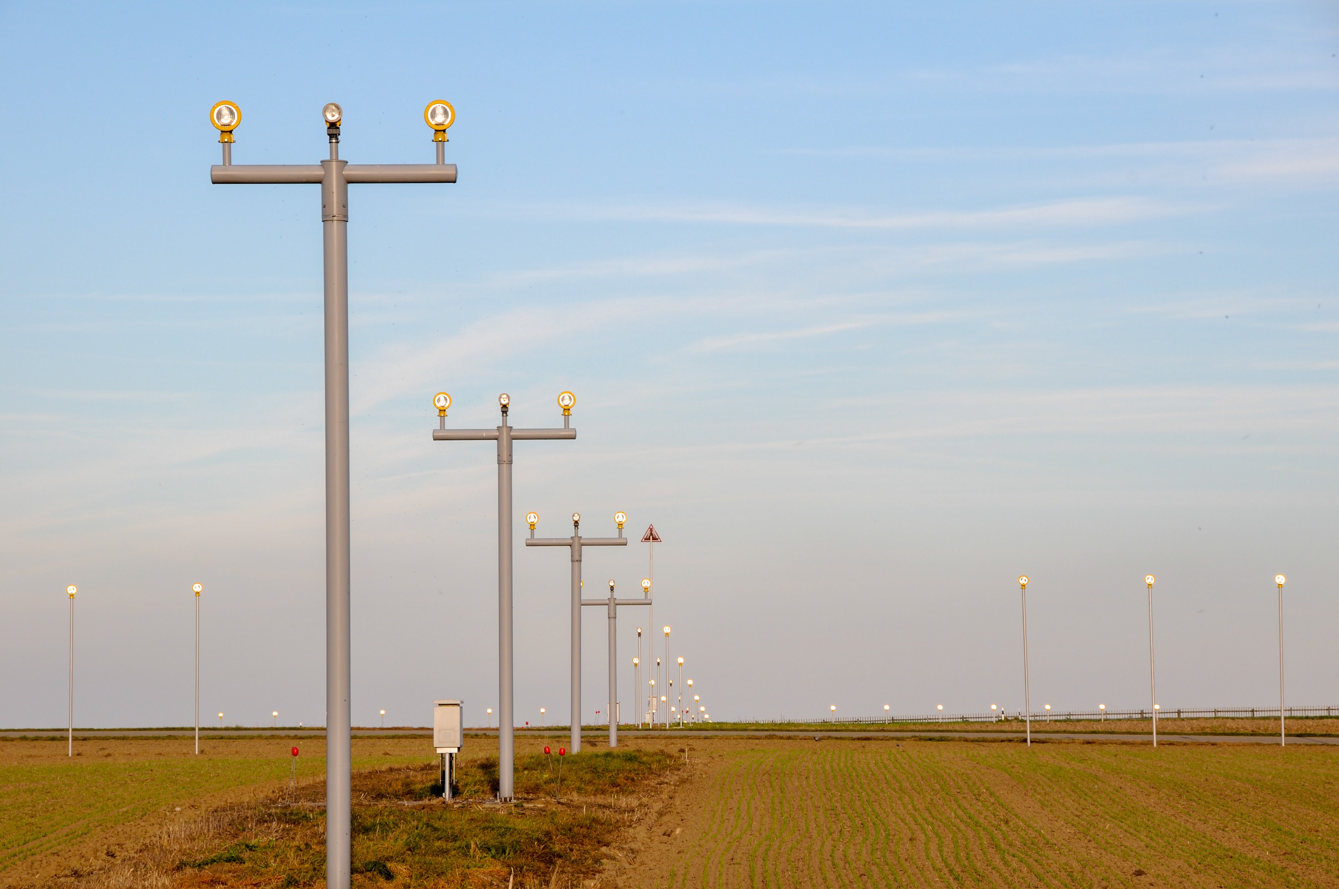... gleichartige (in der Höhe abnehmende) Lampen, die den Flugzeugen den Weg zur Landebahn weisen.