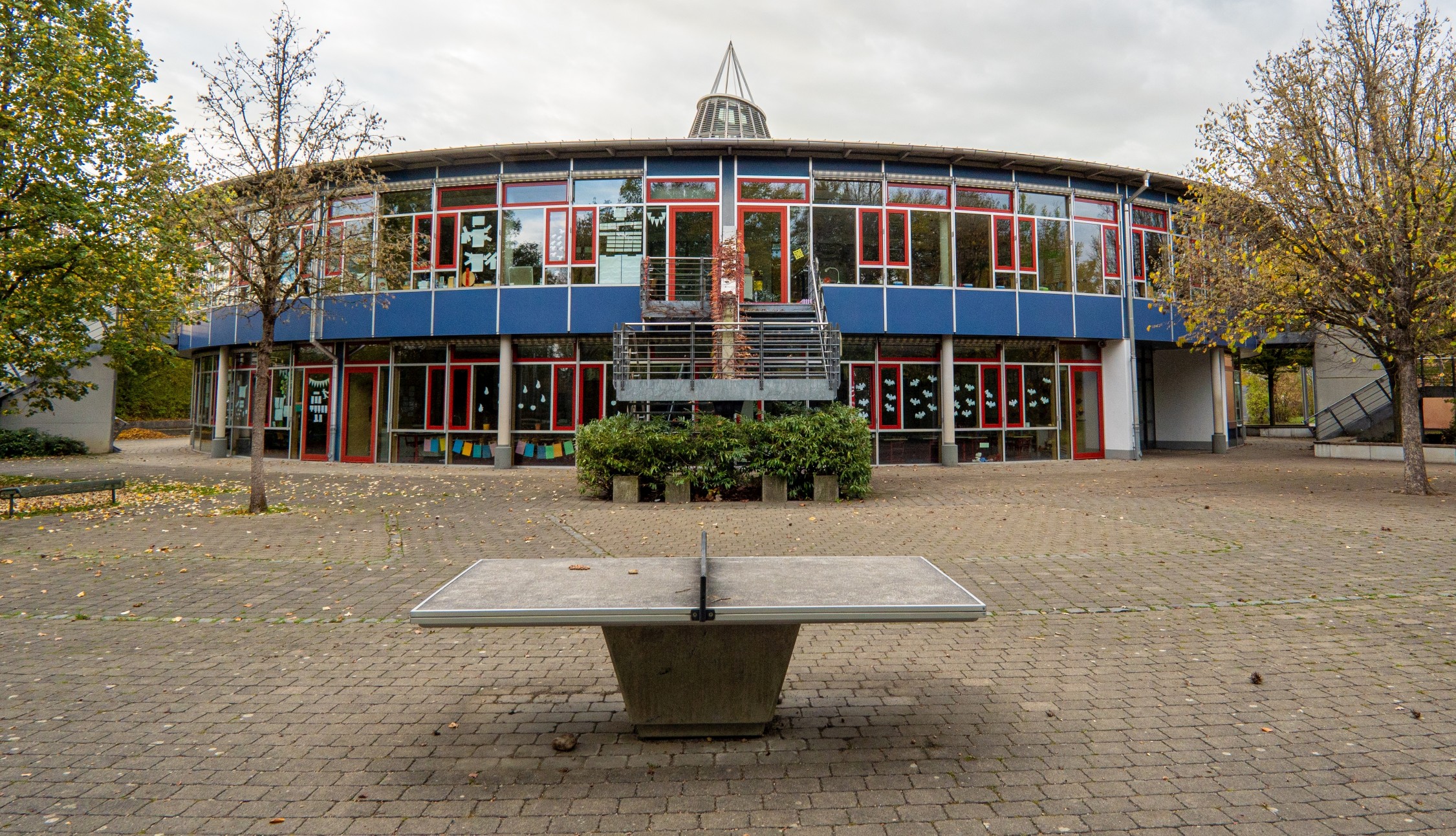 ... manchmal aber auch bei profanen Bauten, wie hier bei einer Schule. Es ist sicher kein Zufall, dass die Tischtennisplatte genau dort aufgestellt ist.